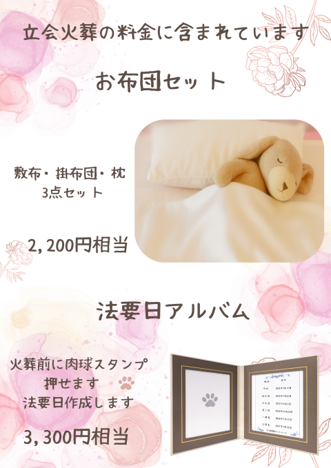 当霊園の立会火葬は、お布団セットや法要日アルバムなどのお見送りに必要なものを料金に含めております。